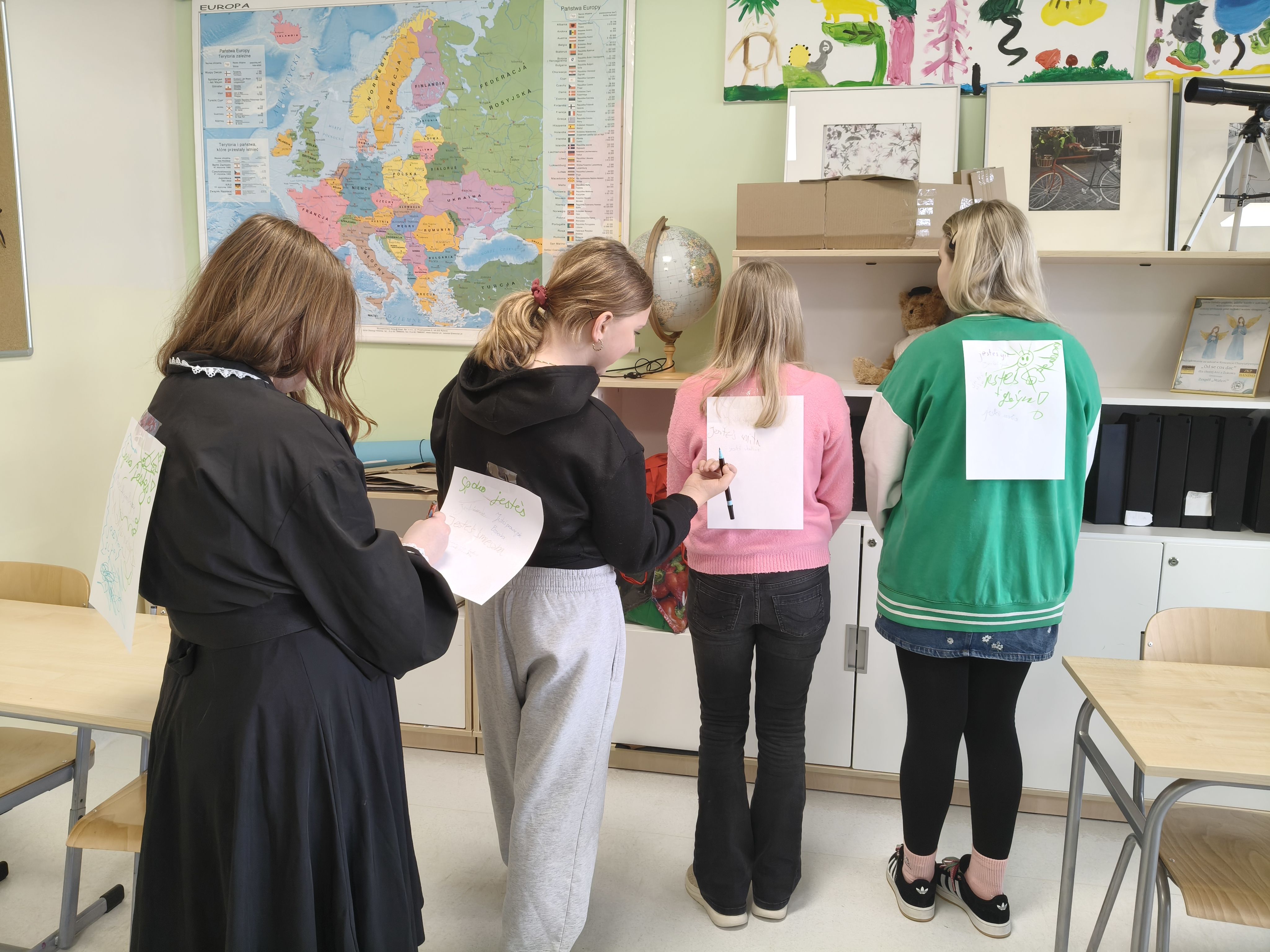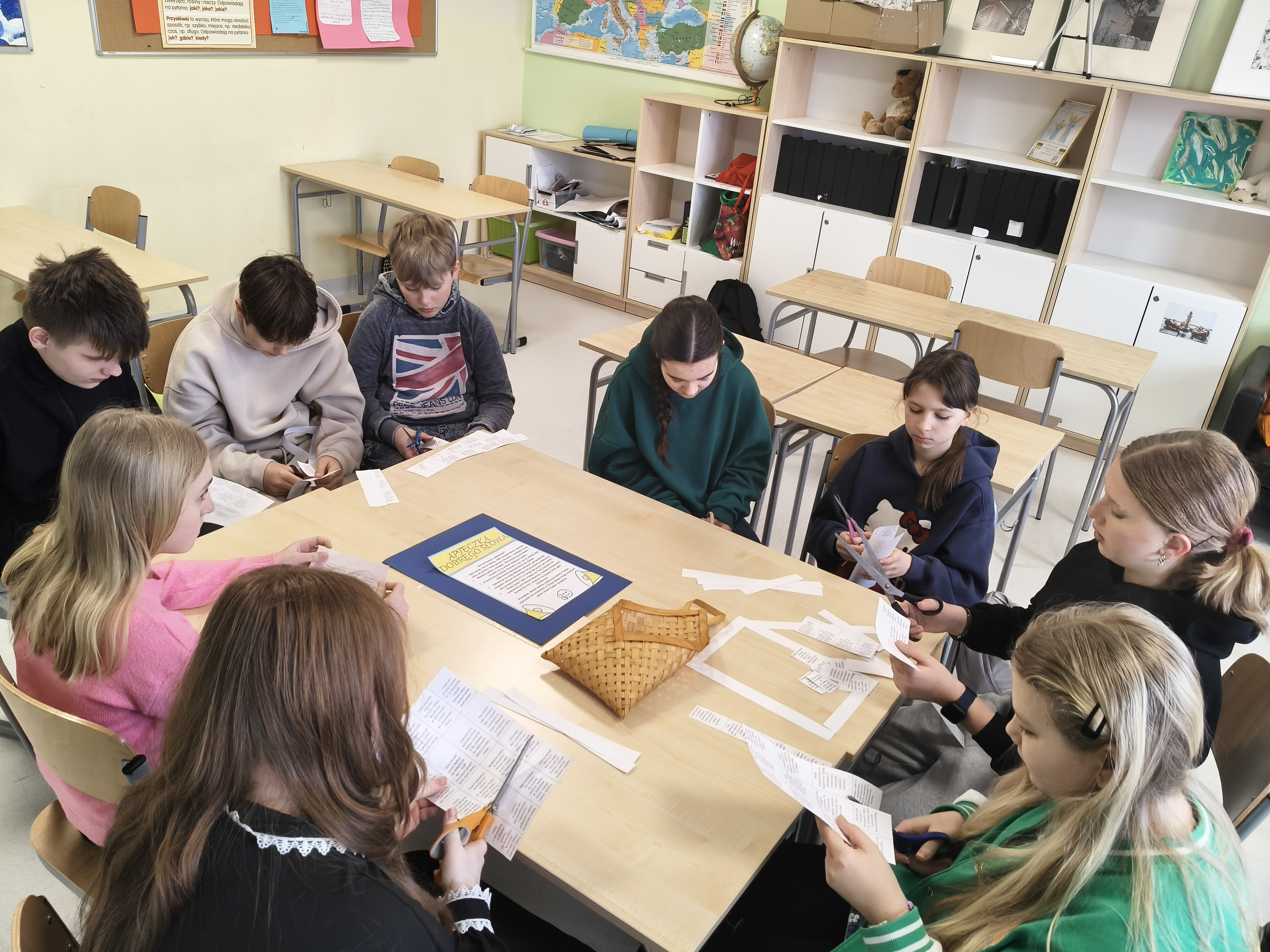 W ramach kampanii „Słowa mają moc”, nasi uczniowie z klasy 6b udowodnili, że życzliwość to supermoc, którą każdy z nas ma w zasięgu ręki. Uczniowie wspólnie przygotowali wyjątkową Apteczkę Dobrego Słowa. To zestaw „leków” na gorszy humor, smutek czy brak wiary w siebie. Zamiast tabletek – krzepiące afirmacje, komplementy i słowa wsparcia, które potrafią zdziałać więcej niż niejeden syrop! Sporo emocji wzbudziło jednak ćwiczenie, w którym uczniowie poczuli siłę dobrego słowa... dosłownie na własnej skórze! Każdy miał przyklejoną na plecach kartkę. Zadaniem kolegów i koleżanek było napisanie czegoś miłego o danej osobie. Wierzymy, że to, co mówimy i piszemy do innych, buduje ich świat. Brawo 6b za dojrzałość, empatię i pokazanie, że można dzielić się dobrym słowem na wiele sposobów!